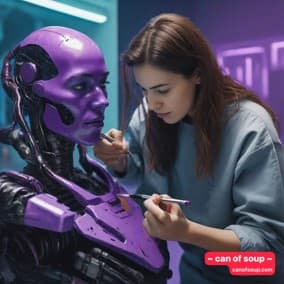 Ideogram and image of Ann Bordetsky building a robot in 2077 from Can of Soup as of December 2023
