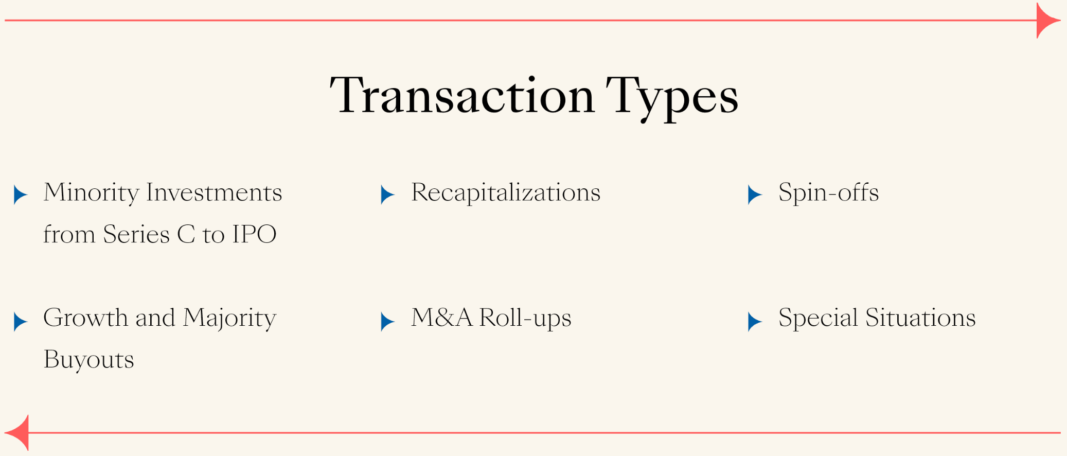 Today, we not only invest across a wide range of stages, sectors, and geographies but an expanding set of transaction types. Our flexible mandate allows us to make investments ranging from $50 to $300M or more, and we can tailor transactions to align with a company’s long-term goals, including minority investments, majority buyouts, recapitalizations, and more.