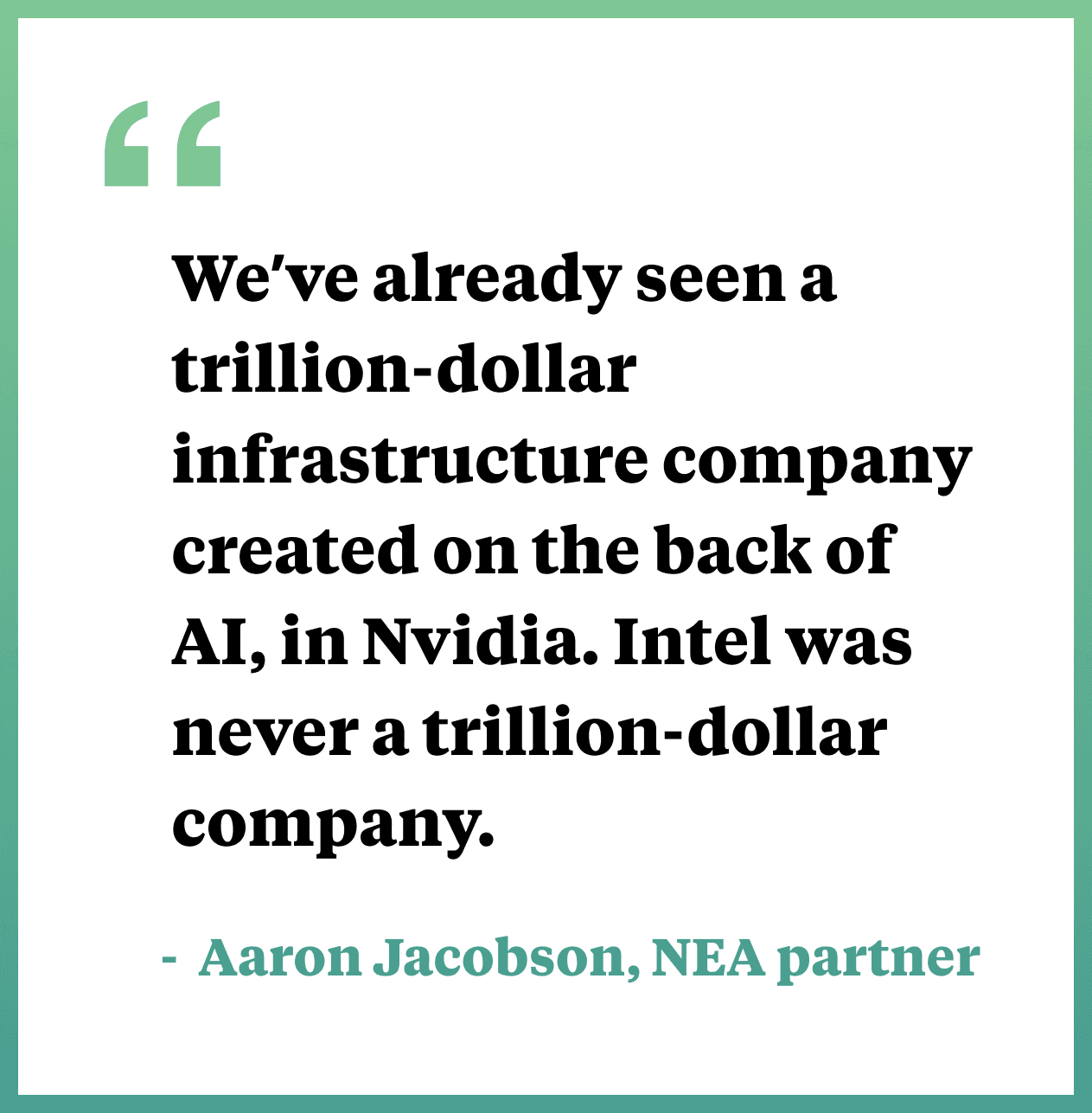 “The bang for the buck on every dollar invested in AI infrastructure will be far more than in past eras, which means the potential for this generation of companies could dwarf anything in the past,” says Jacobson. “That’s why we’ve already seen a trillion-dollar infrastructure company created on the back of AI, in Nvidia. Intel was never a trillion-dollar company despite powering the PC and cloud revolutions.” Privately held OpenAI’s valuation is nearly $30 billion, more than Ford Motor Company.