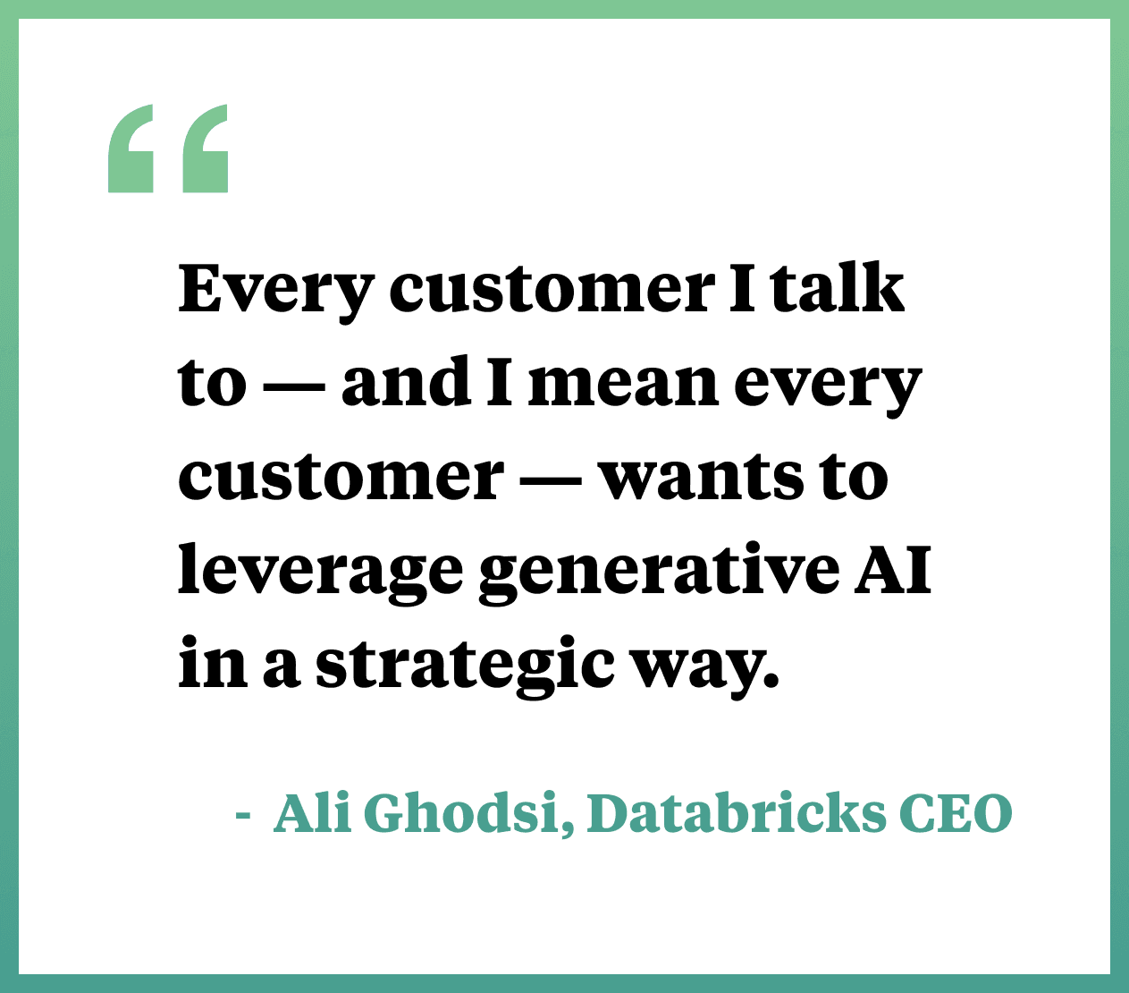 Even among tech infrastructure booms, this one stands out. For starters, companies of all sizes and in every vertical industry are embracing generative AI with astonishing speed. “Every customer I talk to — and I mean every customer — wants to leverage generative AI in a strategic way,” says Databricks’ Ghodsi.