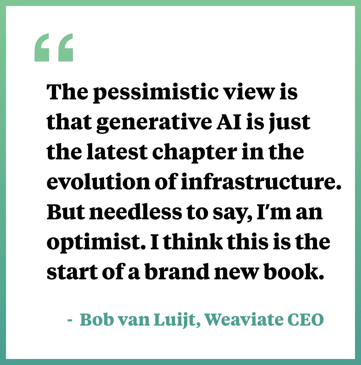 The good news is that demand is not a problem for the moment. “If I described a vector database to a CTO or CIO a year ago, they would have said, ‘What would I do with that?’” says Van Luijt. “That has completely changed. Now, every C-level executive has a generative AI strategy or is tasked with coming up with one. All we need to say is: We can power that. So how can we help you?”