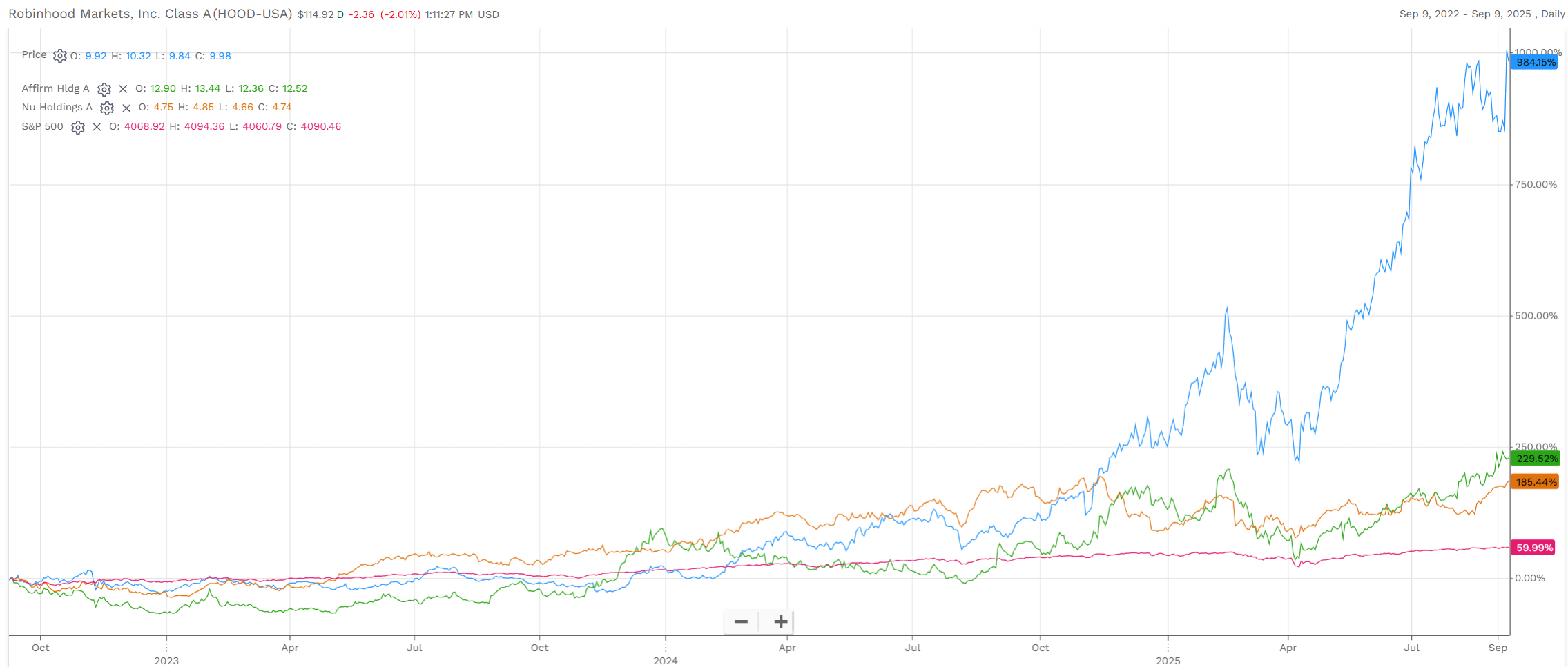 The wave unfolded across categories and geographies, really wherever infrastructure gaps made the cost structure of legacy finance unworkable. In China, WeChat turned payments and credit into messaging features. In the U.S., Robinhood rebuilt equity trading without brokers; or Cash App, which started as a simpler P2P payments platform, assembled a deposit-taking business without branches. In Brazil, Nubank has shown that with no branches and lean ops, a bank could profitably serve 90mm users at a cost-to-serve under $1 a quarter. That compression did not just juice margins but unlocked entire cohorts of low-ARPU users.