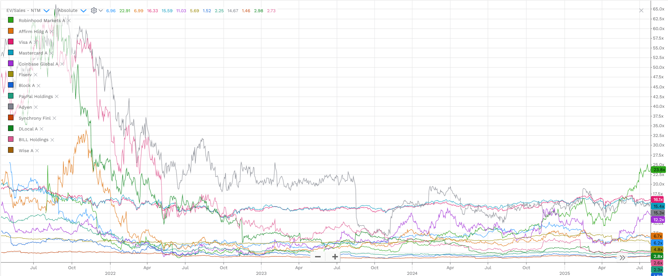 Importantly, the rise in value (perhaps with the exception of Robinhood and Coinbase) is not based on inflated multiple expansion as much as fundamentals. Consider EV/ NTM sales multiples over time for some iconic names: