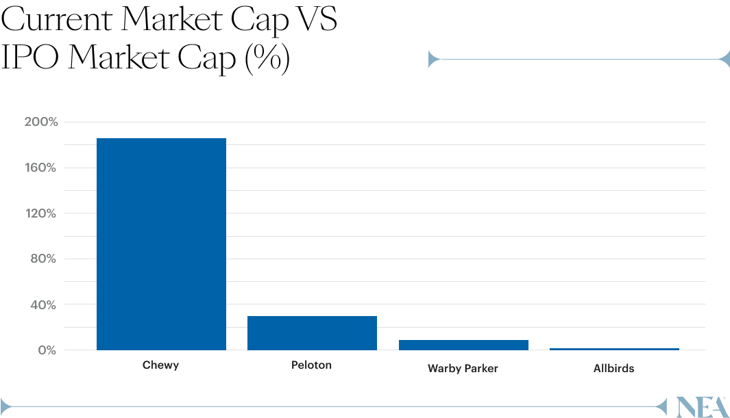 İki D2C markasının hikayesi: Allbirds ve Chewy. Her ikisi de üç yıl içinde kuruldu, sırasıyla 2.1 milyar ve 8.7 milyar dolar değerle halka arz oldular. Bugün, Allbirds'in piyasa değeri 100 milyon doların altında. Ancak Chewy, 2021'deki zirvelerden çoklu sıkışmalarına rağmen, 16 milyar dolarlık bir piyasa değeri, 20 milyon müşteri tabanı ve 2024 FY'de 11 milyar doların üzerinde satışlar, çoğunlukla aboneliklerden korudu. Diğer D2C şirketleri ölçeklenebilirlikle sürdürülebilir bir CAC ve tutkunluğu korumakta zorlanırken, Chewy'nin grupları doğal kategori genişlemesi yoluyla zamanla harcamalarını artırdı.