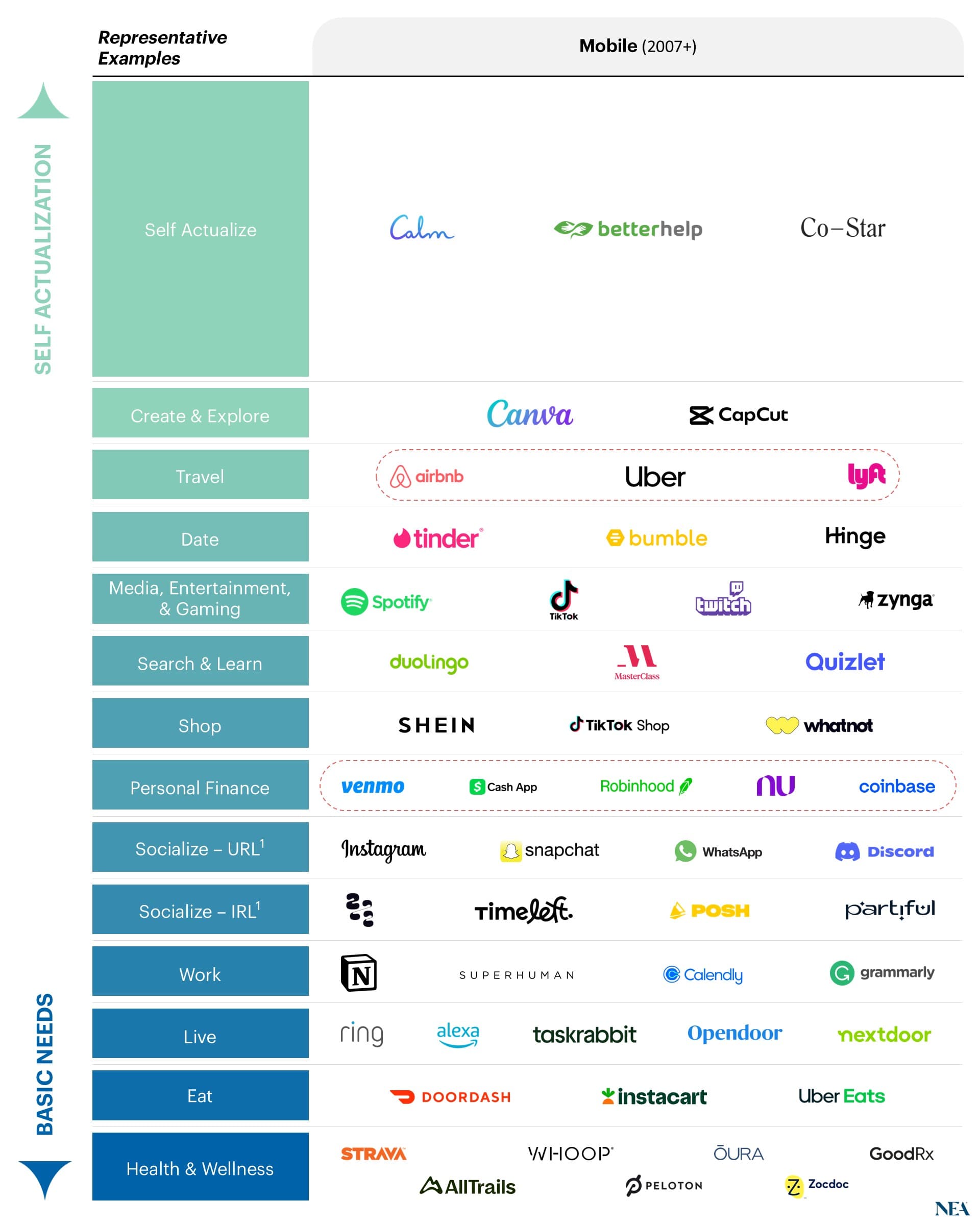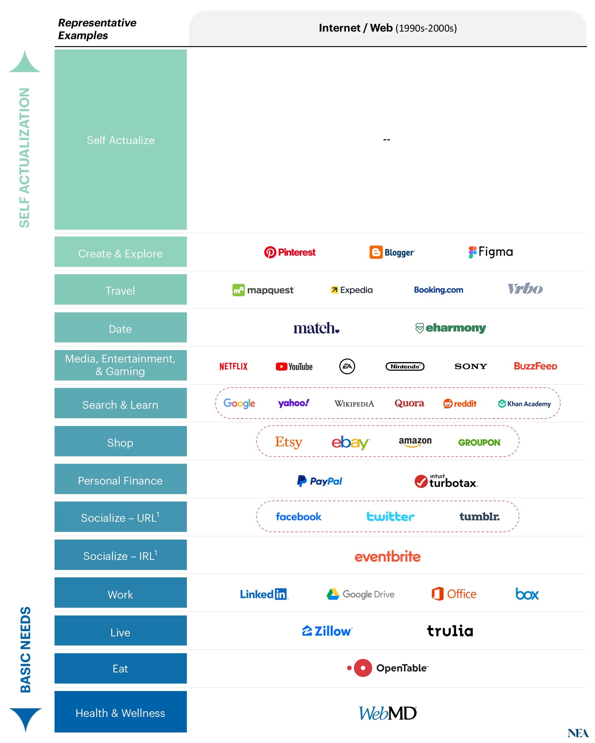 Geniş bir şekilde uyguladık Maslow'un İhtiyaçlar Hiyerarşisi günlük yaşantımızı teknoloji yoluyla ifade eden bir harita sunmak. Tabii ki, tüm kategoriler eşit şekilde yaratılmamıştır. Her bir kategoriye şekil veren ekonomik ve zaman kısıtlamalarını göz önünde bulundurmalıyız, pazar potansiyelini belirlemek için. Geriye dönüp baktığımızda, internet ve mobil dalgalarından kaynaklanan benimsemme ve değer yaratma kalıplarının ilgi çekici olduğunu gözlemliyoruz.