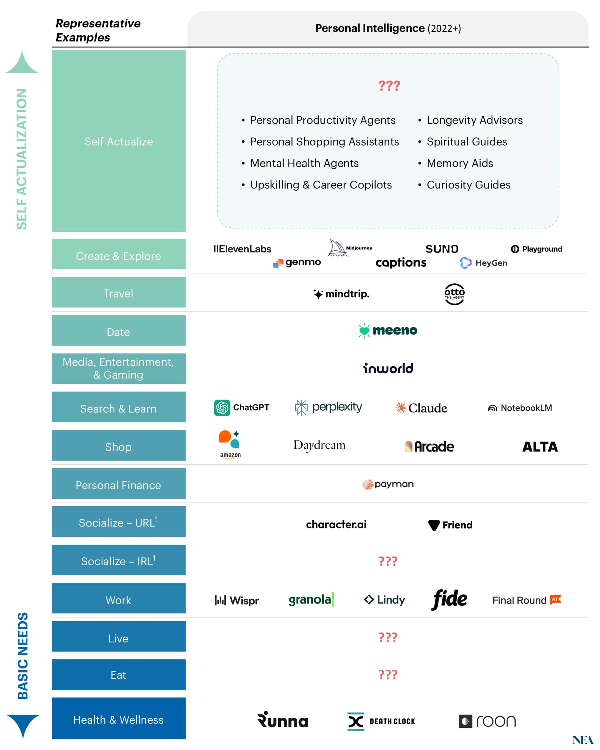 Önceki dalgalar tarafından karşılanan birçok temel ihtiyaçla, bugünkü yeniliklerin kendiliğindenleşme arayışını açığa çıkarmak için özel bir konumda olduğuna inanıyoruz: merak, yaratıcılık ve tatmin. Benzer platformlar gibi Perplexity, ChatGPT, and NotebookLM are bilgi arayışımızı ve entelektüel merakı tatmin etme yöntemimizi devrimlendiriyor. Yaratıcı platformlar gibi ElevenLabs, Suno, Midjourney, Genmo, ve Heygen Sanatsal ifadeyi çeşitli ortamlarda demokratikleştiriyoruz. Tecrübe güdümlü kategoriler, bir sonraki sınıra doğru çıkmaya başlıyor, platformlar gibi. Mindtrip, Arcade, and Alta elevating Kişiselleştirme ve doğal dil ile seyahat ve alışveriş keşfi.